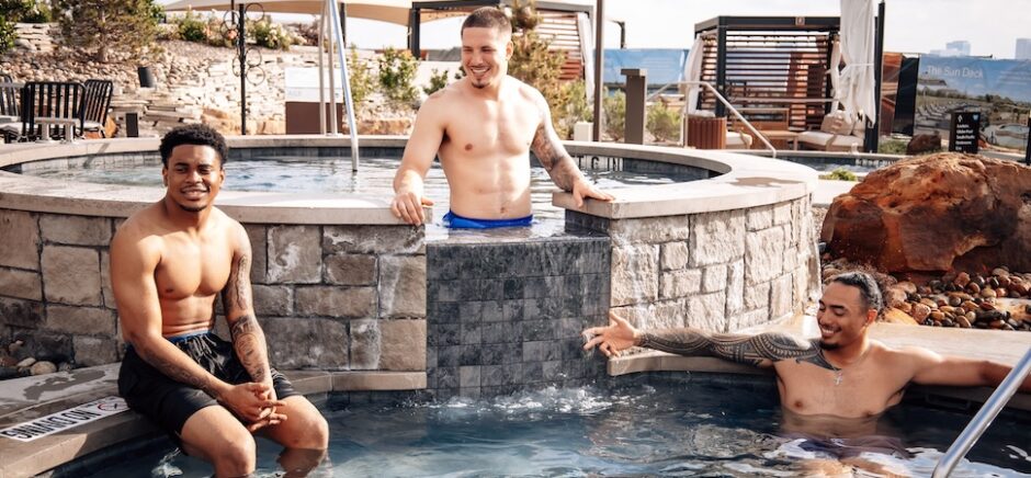 Dallas Cowboys Zion Childress, Justin Barron, and Marist Liufau soak up some wellness at WorldSprings at Grandscape in The Colony. [Photo: WorldSprings]
