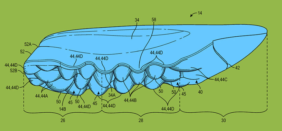 Nike has received a newly granted patent for a sole design aimed at boosting forward momentum. Invented by Joseph L. Helseth of Plano, the footwear structure features an arched midsole profile with downwardly extending protrusions under the midfoot and heel to help propel the wearer and reduce strain. [Composite illustration: Sources, USPTO Patent #12402692, Fig. 2; DI Studio]