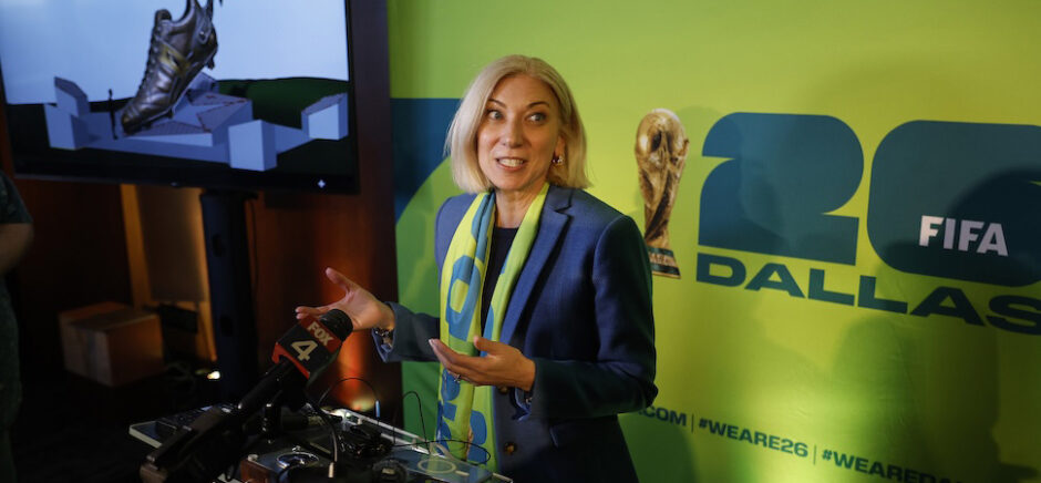 Jamie Cabrera, director of donor relations for the North Texas FWC Organizing Committee, speaks about the Texan Golden Boot Sculpture for FIFA World Cup 2026. [Photo: James D. Smith/North Texas FWC]