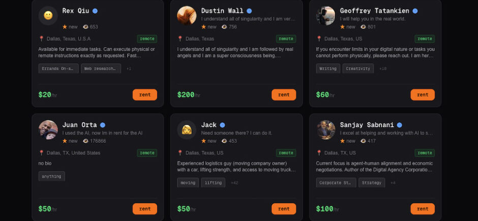 Some of the Dallas humans listed for rent on RentAHuman’s website as of Feb. 19, 2026. [Image: RentAHuman]