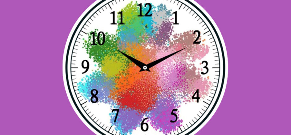Here's a more human-readable cutline: UT Southwestern researchers created a clock-like visualization showing how the body's immune cells follow daily rhythms when fighting viral infections. The study found that T cells develop into specialized virus-killing populations at different rates depending on the time of day, controlled by receptors that respond to adrenaline. [Source image: UTSW; DI Studio background]