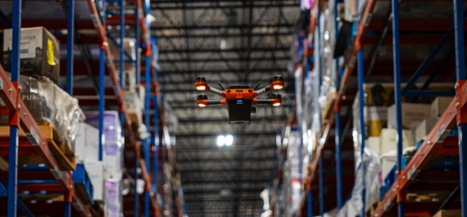 A Corvus One autonomous inventory drone performs a cycle counting mission at Southern Glazer’s Wine & Spirits distribution center in Raymore, MO. [Photo: Corvus Robotics]