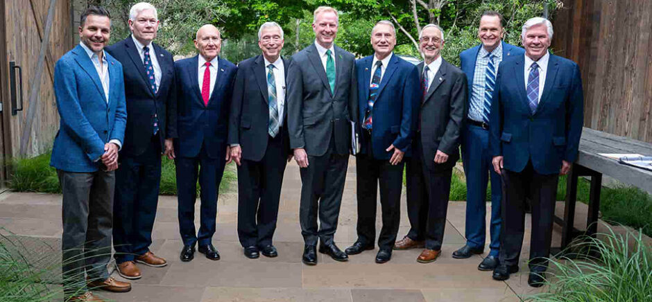 From left: Stephen Rodriguez, DCVC, managing partner for One Defense who is leading the initiative’s Executive Steering Group; U.S. Congressman Pete Sessions; Darcy Anderson, vice chairman of Hillwood, a Perot Company; Terry Pohlen, Ph.D., professor, director of the Jim McNatt Institute for Logistics Research and senior associate dean of UNT’s Ryan College of Business; UNT President Harrison Keller, Ph.D.; Major General Clint Crosier, U.S. Space Force, Ret., and AWS Aerospace and Satellite Solutions; former Deputy Secretary of Defense and former Secretary of the Navy Gordon England; Wesley Randall, Ph.D., UNT professor of logistics; and Lt. General Harry Raduege, U.S.A.F., Ret., The Cohen Group [Photo: UNT]