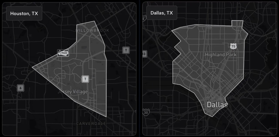 Tesla Robotaxi Houston and Dallas service areas. [Image: Tesla Robotaxi/X]