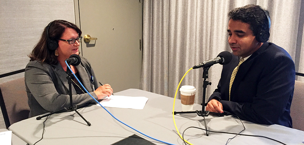 Texas Health’s Aleshia Howe talks with Dr. Rishi Manchanda, president and founder of HealthBegins and RxDemocracy, on the Texas Health Out Loud podcast. [Photo courtesy of Texas Health Resources]