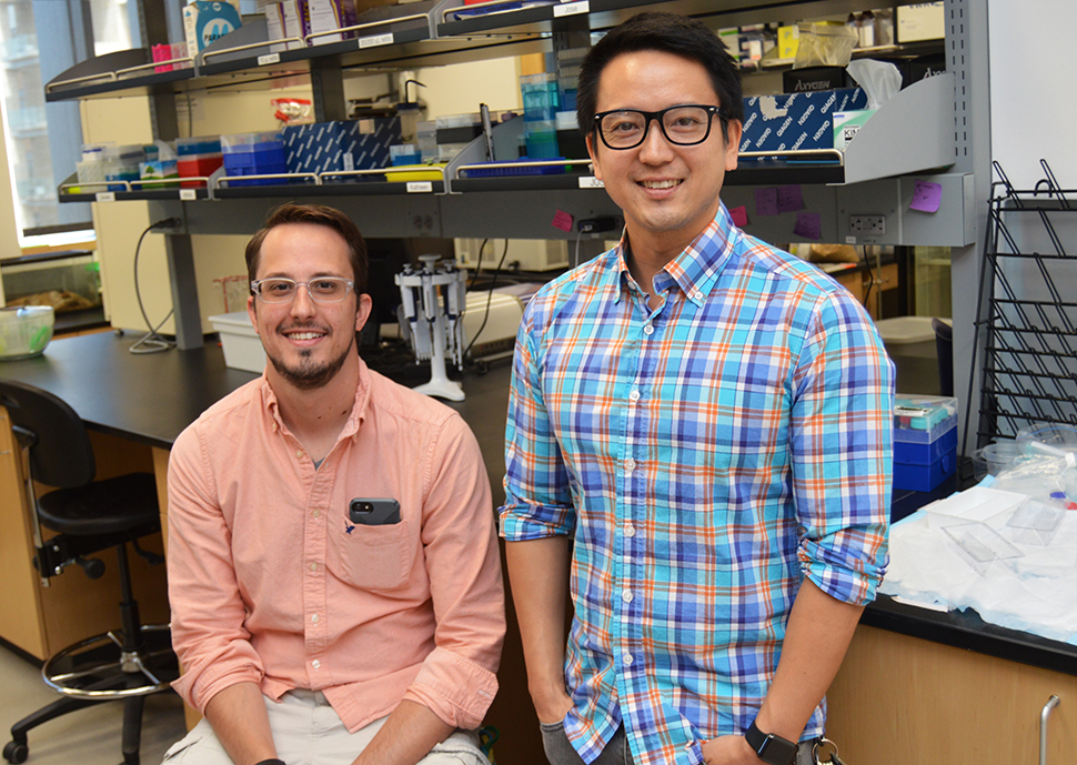 Matthew Fujita, right, UTA assistant professor of biology and principal investigator on the $714,992 National Science Foundation Division of Environmental Biology grant, with graduate research assistant T.J. Firneno. [Photo courtesy of University of Texas at Arlington]