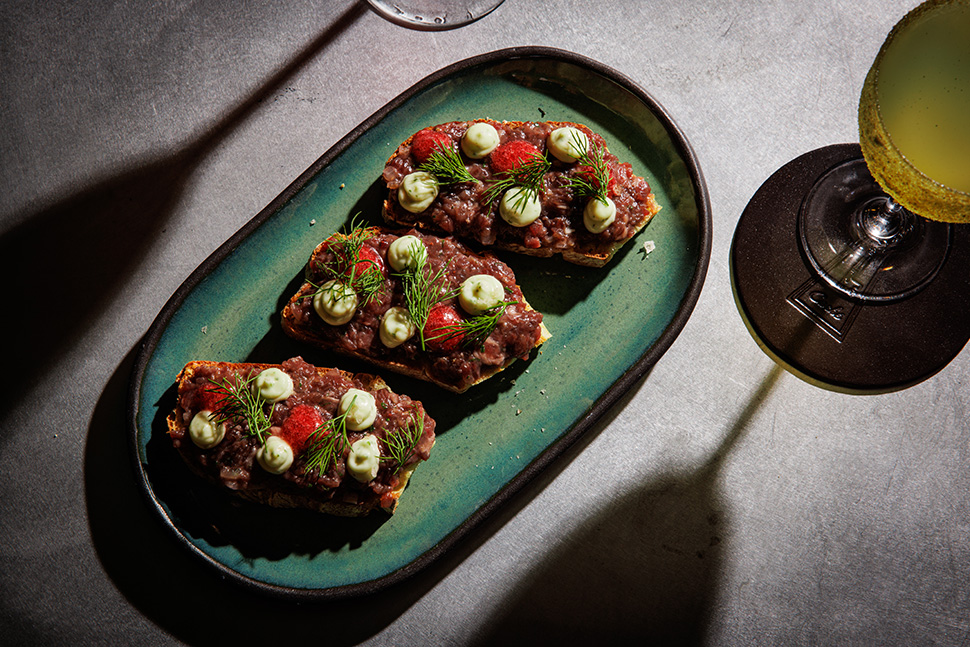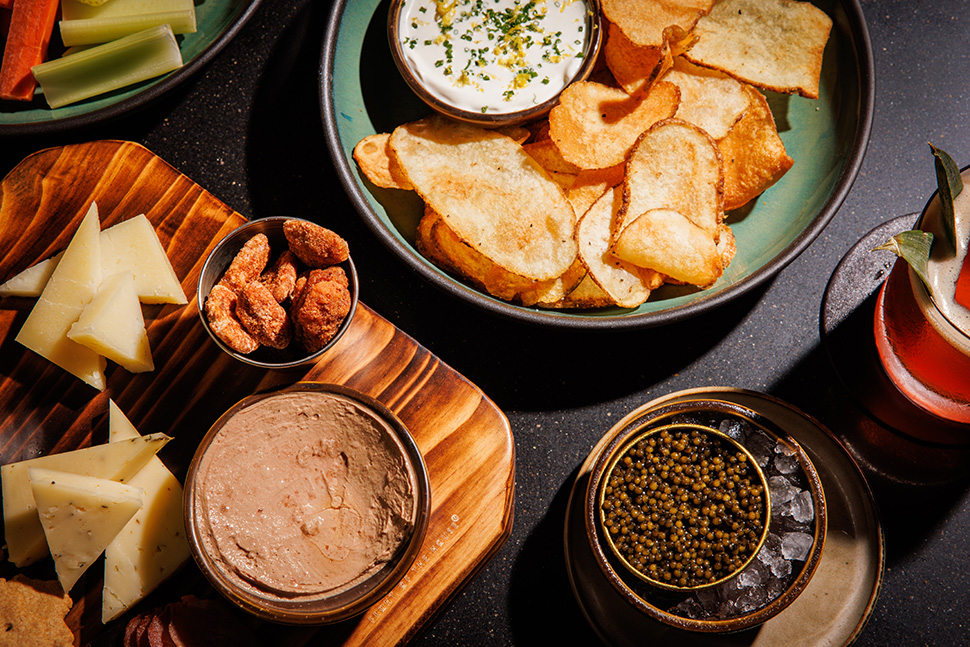Advanced Sommelier Jesse Rodriguez, who previously led the wine program at The French Laundry, curated Caché’s wine list. A menu of elevated small plates includes caviar service, steak tartare with pickled strawberry jam, black-eyed pea hummus, and panko-crusted deviled eggs topped with truffle pearls.