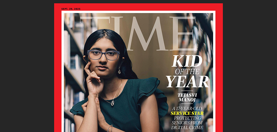 How did Tejasvi Manoj beat those 74 million-to-one odds to land on the cover of TIME? It all started in February 2024, when she was a 16-year-old junior at Lebanon Trail. Riding home from Scouting America camp with her dad, she heard him call her worried 85-year-old grandfather, who was being victimized by an email spoofing scam. Designed to look like a family member’s urgent request for $2,000, it was actually a cybercrime in progress.