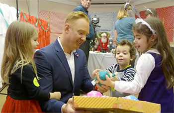 Trigger’s Toys President and CEO Bryan Townsend talks with children during a past Christmas event at Our Children’s House in Dallas. [Photo courtesy of Trigger’s Toys]