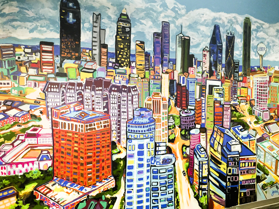 The office gives numerous decor nods to Big D including a colorful mural of downtown that spans an interior wall.