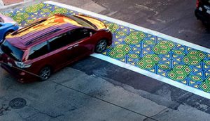 The material, generally used for regulatory pavement markings, is non-slip and designed to withstand car and pedestrian traffic. It’s marketed to last up to eight years.