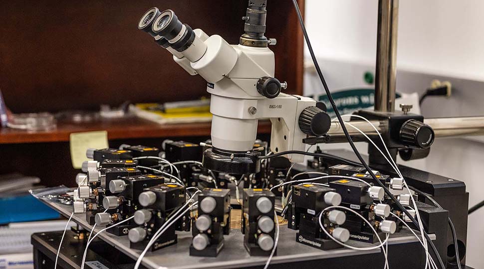 A probe station is used to test small neuromorphic devices in Joseph Friedman’s lab. [Photo: UTD]