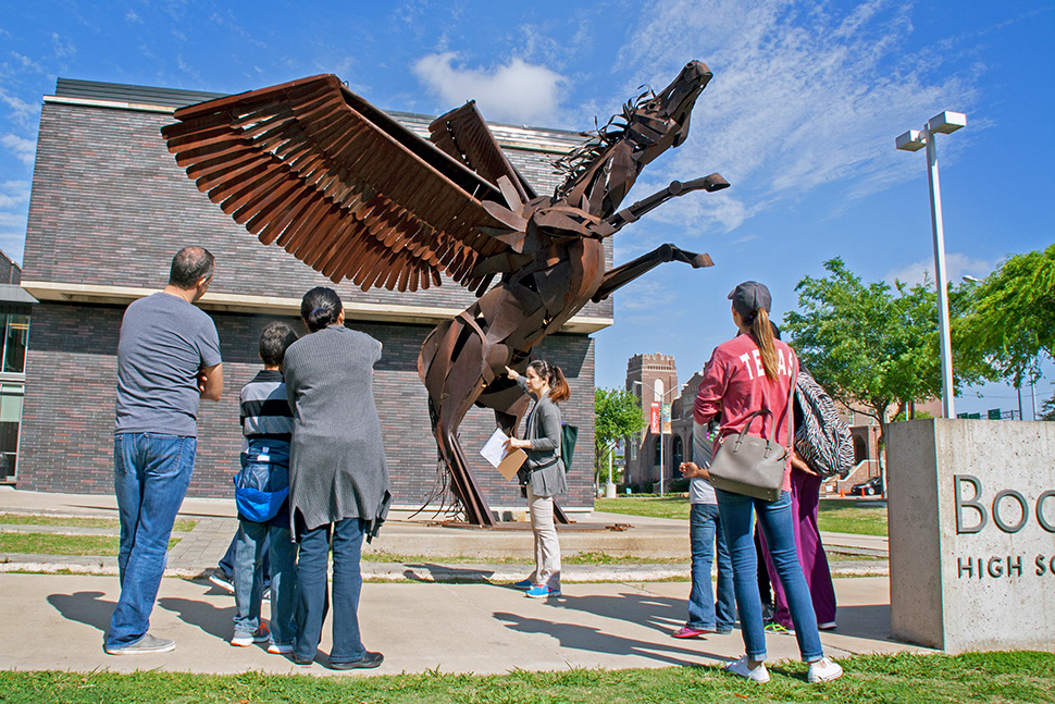 Tour guide Maria Carrero points out shapes in the Pegasus sculpture in front of Booker T. Washington High School for the Performing and Visual Arts during a walkSTEM tour April 1.