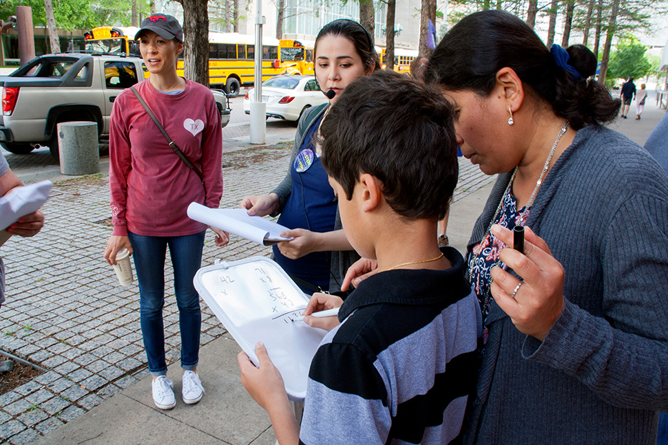Soume Foshee (far right) and her son, Kian Foshee, 9, solve a math problem to estimate the number of tiles across from the Meyerson Symphony Center.
