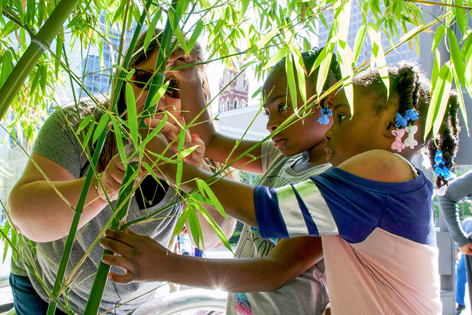 Sisters Mariah Smith, 9, and Skielar Smith, 7, measure the length of a segment of bamboo in front of the Nasher Sculpture Center.
