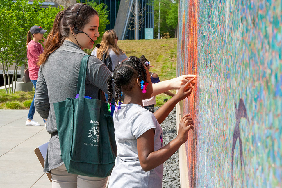Maira Carrero (left) and Mariah Smith, 9, pick out colored tiles on the Genesis, the Gift of Life glass mosiac in front of the Dallas Museum of Art.