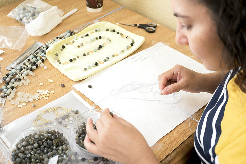 A woman assembles jewelry for Akola’s Neiman Marcus line. [Alex Wolf Photography (c)2015]