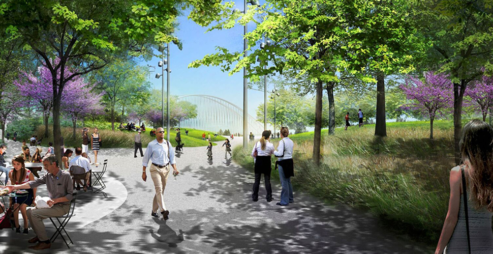 It includes sites for five elevated parks that will extend from inside the levees into the adjacent communities, and it also allows for the Trinity Parkway, which will provide primary access into the park.