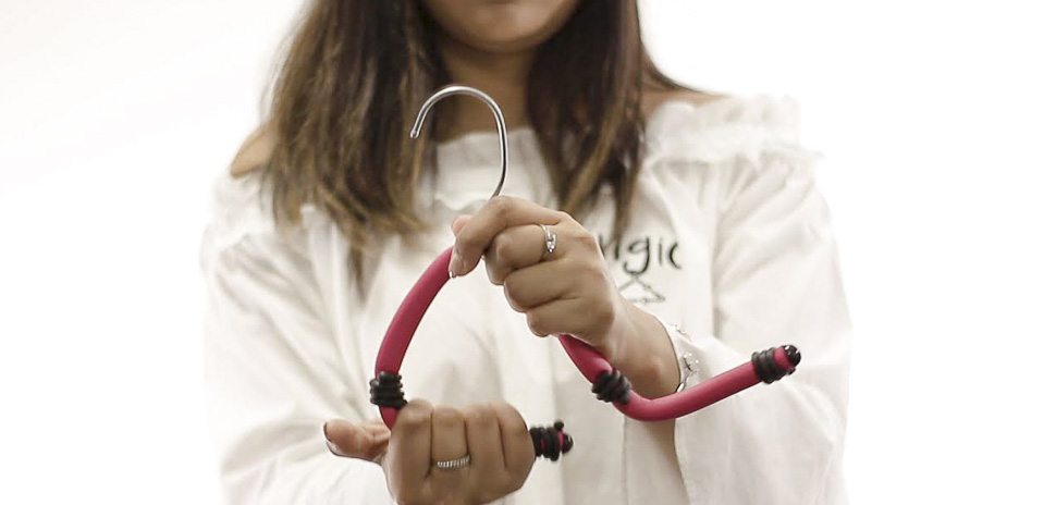 They wanted to make something durable, flexible, and versatile. The Hangio hanger can bend to hold everything from a dress, blouse, spaghetti-strap top, a scarf, or even a winter coat.