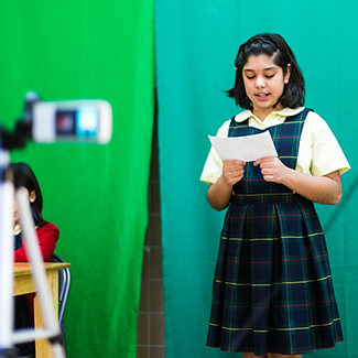 Every school day, students research, produce, anchor, and film a new show, which goes live on Vimeo the next morning at 8. The show, which first airs campuswide, has two anchors, a meteorologist, and extra segments that include word of the day, science facts, and a student telling “lame jokes.” The kids on set may not know it yet, but they are engaging in a hands-on learning experience that will prepare them for the road ahead.