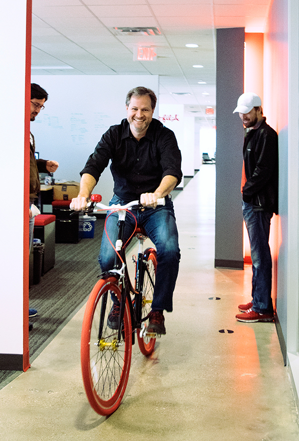 Calvin Carter testing out a new bike in the office. Photo courtesy Bottle Rocket.