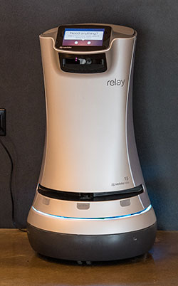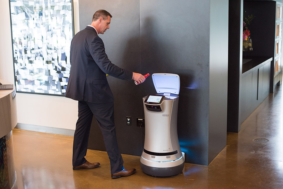 Resembling a sleek, hourglass-shaped trash can, the 3-foot-tall Relay robot named Botlr can greet guests at their doorways with extra towels, a toothbrush, or caffeinated beverage pick me up.