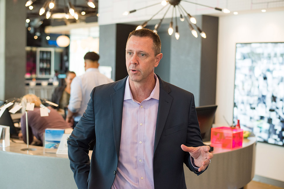 Buehler discusses the functionality of the 3-foot-tall robot. Unlike other delivery robots that require a magnetic strip or beacons to get around, Botlr is autonomous. [Photo: Michael Samples]