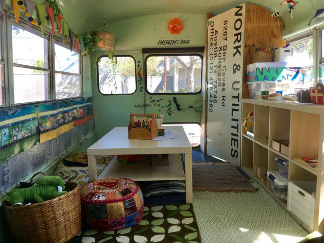The bus, named Matilda, is parked at Twelve Hills Nature Center in Oak Cliff and is surrounded by an outdoor preserve that also serves as a classroom for the preschoolers.