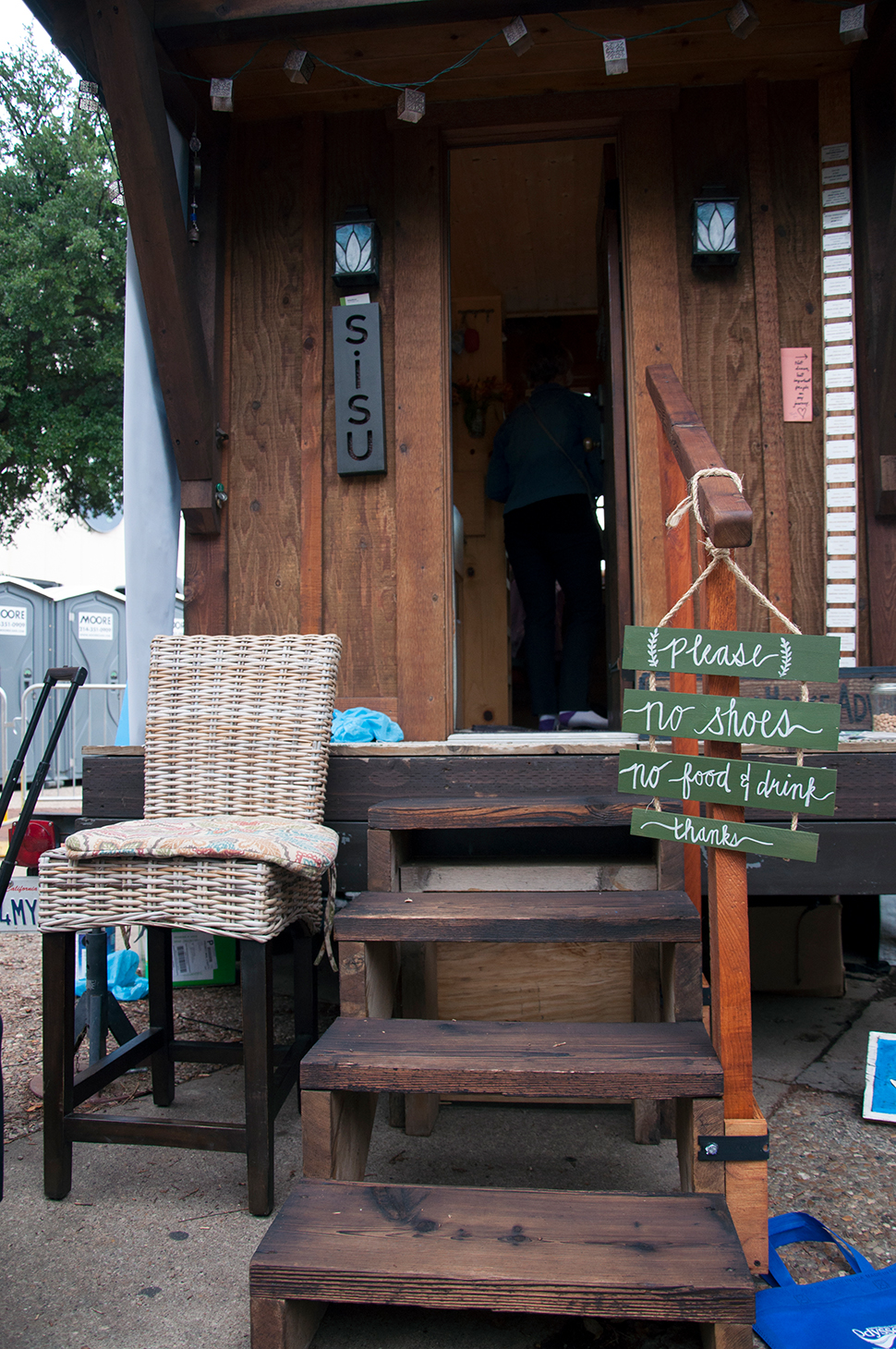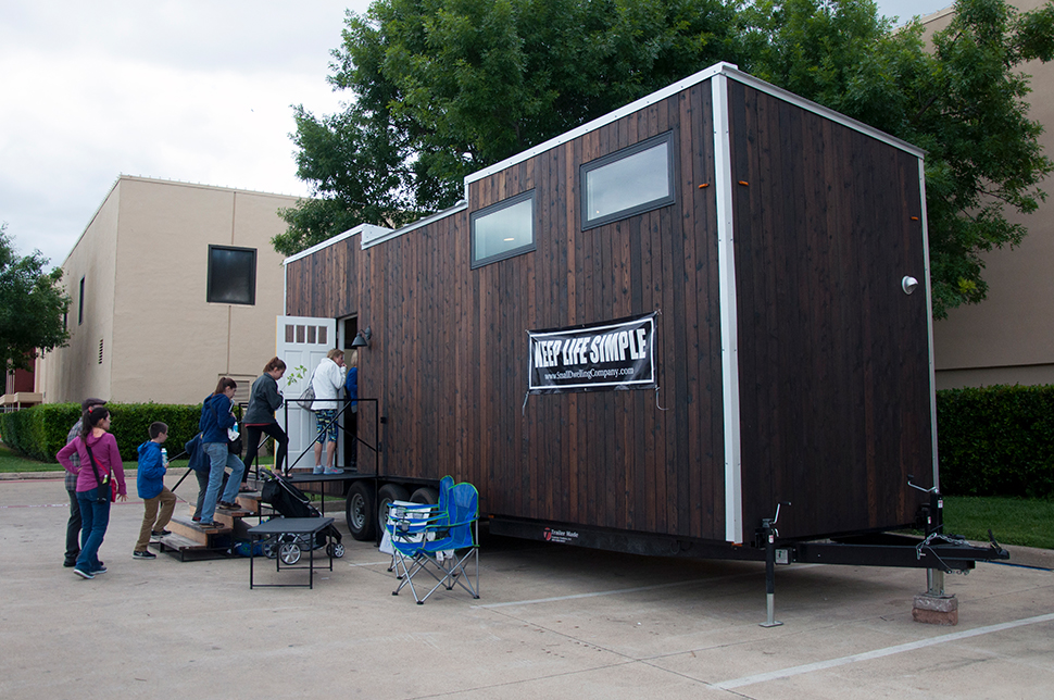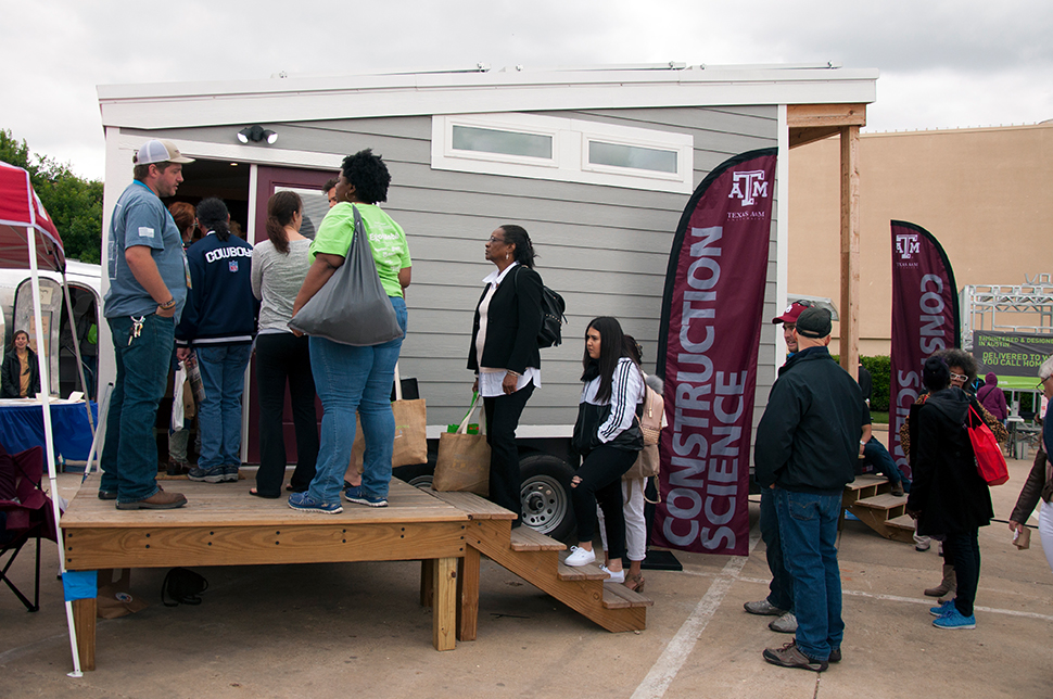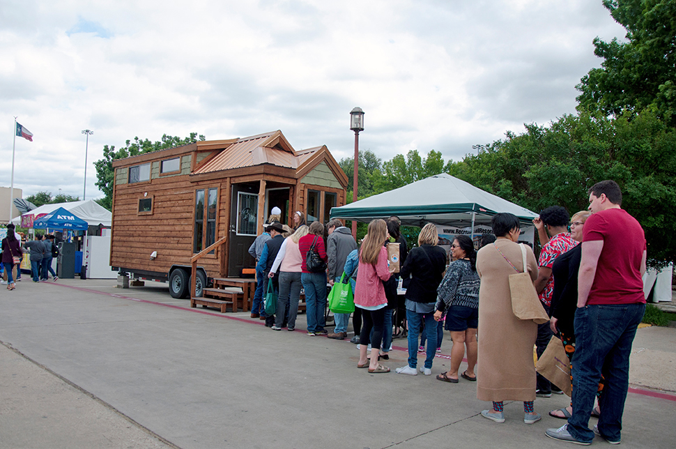 People line up to go through a tiny house in Tiny House Village at Earth Day Texas.