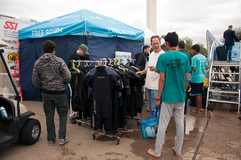 Racks of wetsuits were available for scuba diving participants at Earth Day Texas.