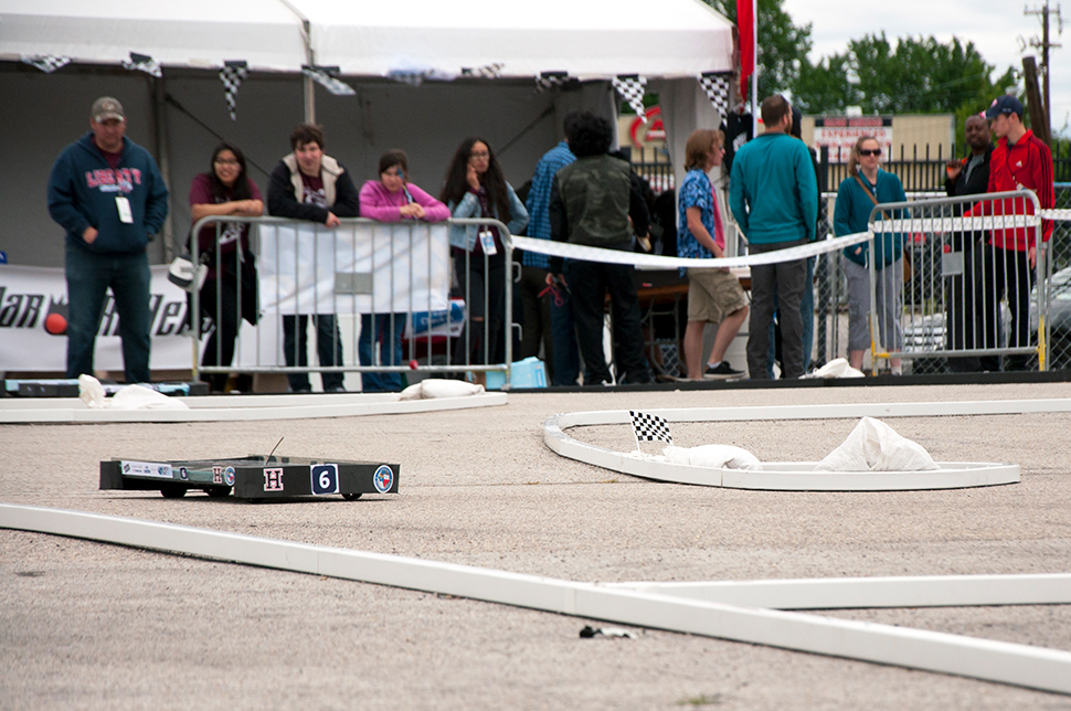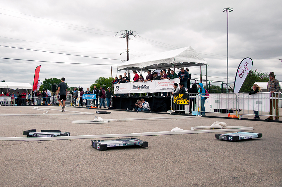 The No. 6 solar car from Rockwall High School races at the Solar Car Challenge at Earth Day Texas.