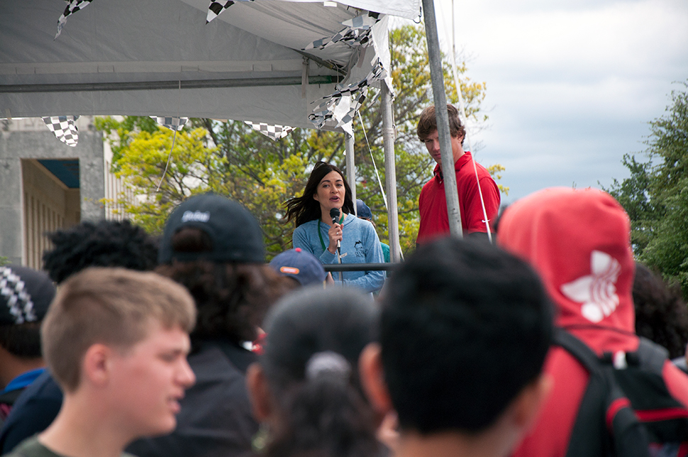 Leilani Münter, race car driver and environmental activist, speaks to the participants and audience at the Solar Car Challenge at Earth Day Texas.