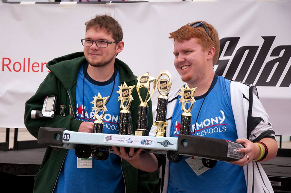 The team from Harmony School of Innovation Garland holds up its No. 10 solar car and multiple awards, including first place overall.