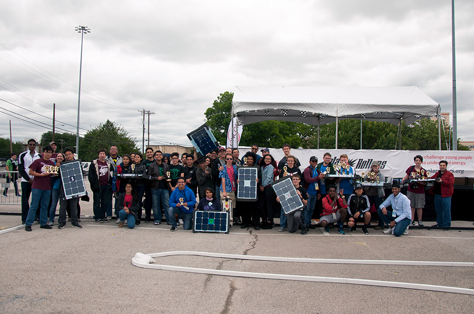 All the participants in the Solar Car Challenge at Earth Day Texas pose for a group picture with their cars and awards.