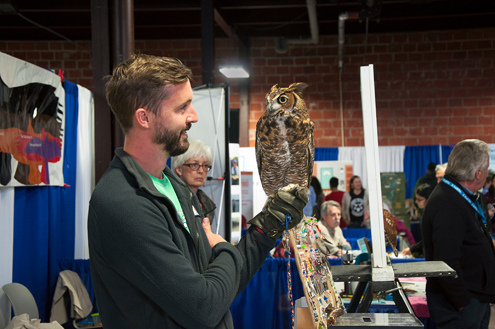An owl is held at the Window to the Wild Inc. booth at Earth Day Texas.