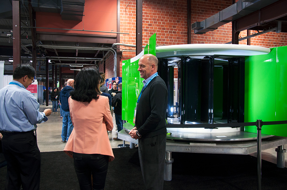 Christopher Griffin, president of Hover Energy, stands in front of its wind turbine and answers questions from the Innovation Expo attendees at Earth Day Texas.