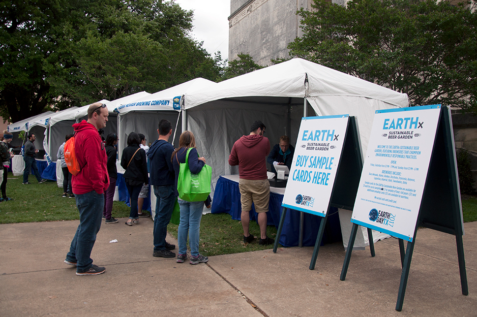 People line up at the Sustainable Beer Garden at Earth Day Texas.