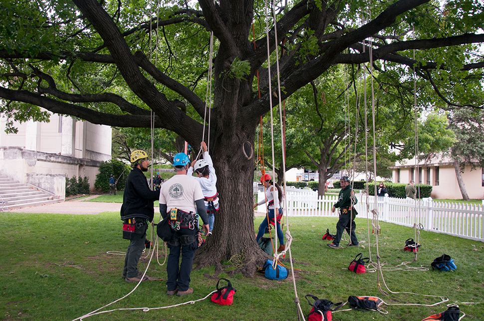 Instructors teach how to climb trees rope-and-harness style in an oak tree at Earth Day Texas.