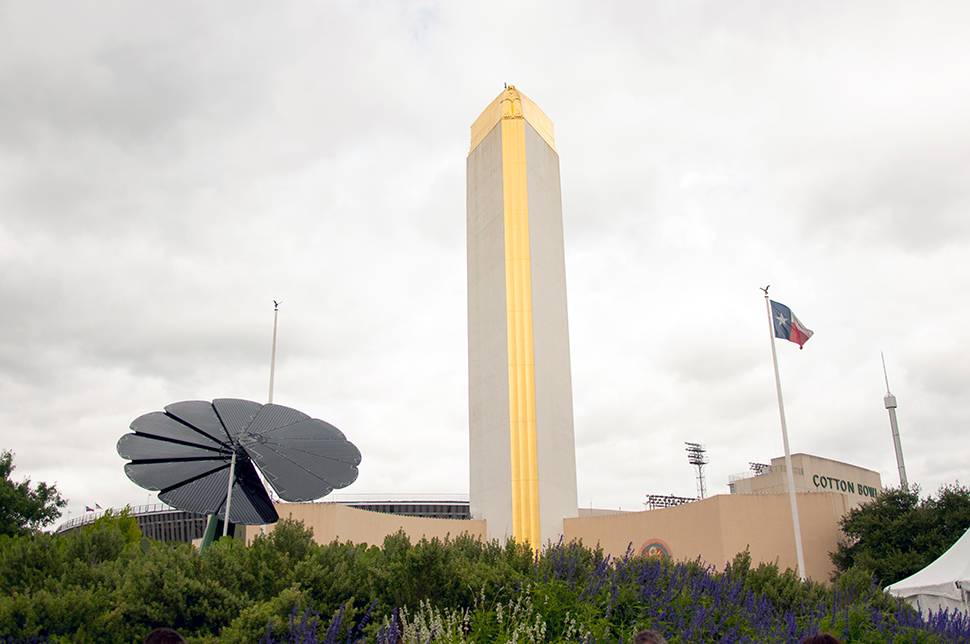 The Smartflower, the world’s first all in one solar electric system, sits in Big Tex Circle at Earth Day Texas. The Smartflower automatically fans out at sunrise to face to sun at a 90-degree angle throughout the day and closes as the sun sets.