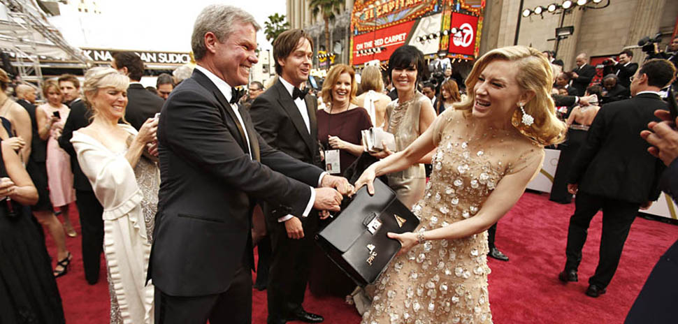 Actress Cate Blanchett plays around with PricewaterhouseCoopers’ Brian Cullinan as she arrives at the 86th Academy Awards. Blanchett won the lead actress Oscar later that night for her role in director Woody Allen’s “Blue Jasmine.” [Photo Courtesy PwC]