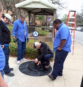 Maintenance workers install one of the donated NRG Street Charge stations at UT Arlington. (Photos courtesy the University of Texas at Arlington)