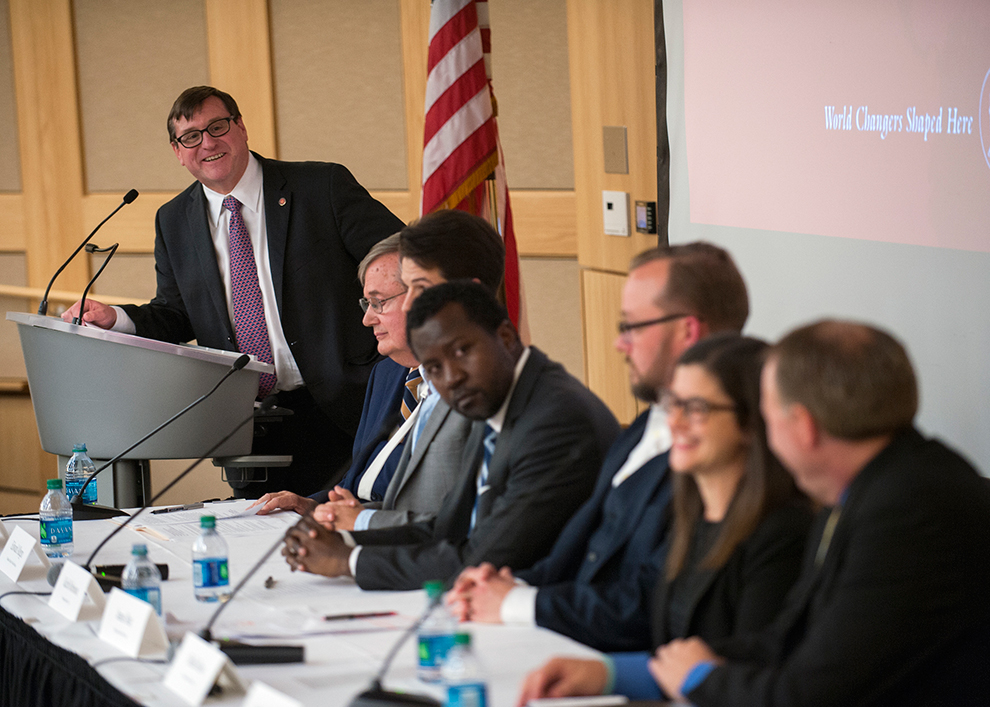 MacFarlane moderates a panel discussion on engaging enterprenerism, which included representatives from SMU’s seven schools. Photo by Hillsman S. Jackson/SMU.