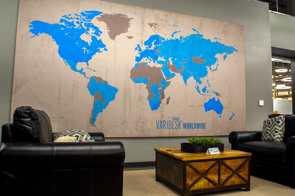 A world map in the lobby of the Varidesk headquarters shows the countries in which they have done business in, represented in blue.