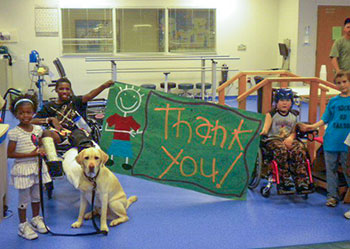 Children hold a sign with Trigger the dog thanking the nonprofit for its help. [Photo courtesy of Trigger’s Toys]