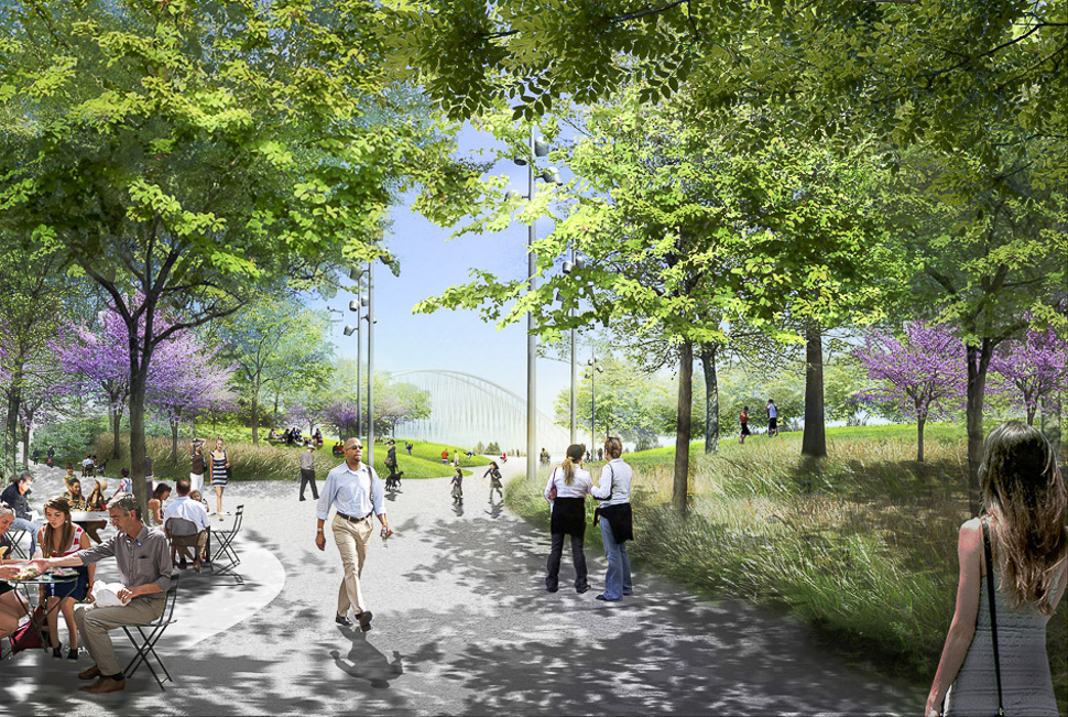 The Trinity River Park concept in the Trinity River floodway looking southeast. Two elevated overlook parks are located on the downtown side at Riverfront Boulevard and Reunion Boulevard. One elevated overlook park is located on the west side at Commerce Street. The river meanders in a more naturalized state with a varying river landscape including trails running throughout the corridor.
