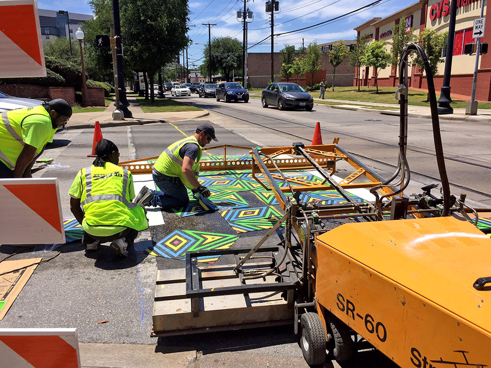 Workers use Ennis-Flint’s reciprocating infrared heating technology to apply its custom brightly-colored preformed thermoplastic on the crosswalk.